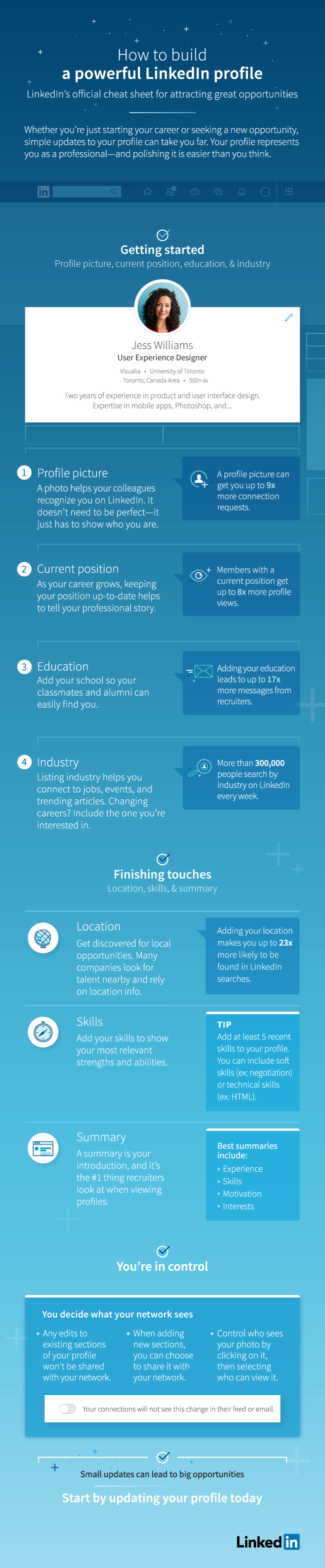”Building a robust profile is easier than you think. Start with your photo, position, industry and education- this makes it easier for your professional network and recruiters to find you. Make finishing touches by adding your location, skills and a summary. Not sure what to say in your summary? We’re making this simple for you by providing a suggested summary – all you need to do is personalize it.”
